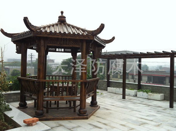 石家莊天澤防腐木所制作的防腐木涼亭做工精良,雕刻精良,不管是柱子還是護欄用手觸摸都非常光滑。我們的防腐木原料有樟子松、鐵杉、黃松等等。